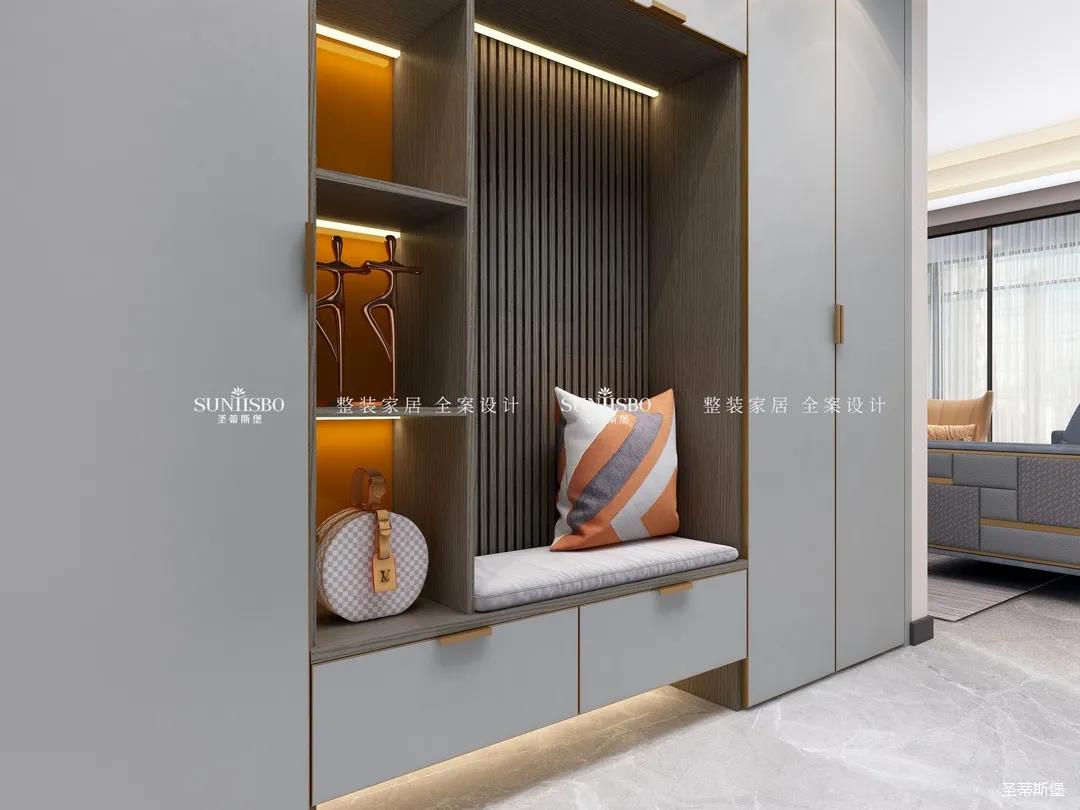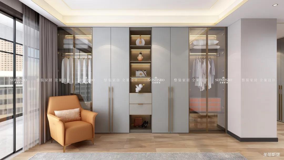衣帽间选择浅灰作为空间主色调,设计师在衣帽间用与整体空间相似的爱马仕橙作为点缀,使空间具有“简于形,奢于心”的时尚审美内涵。