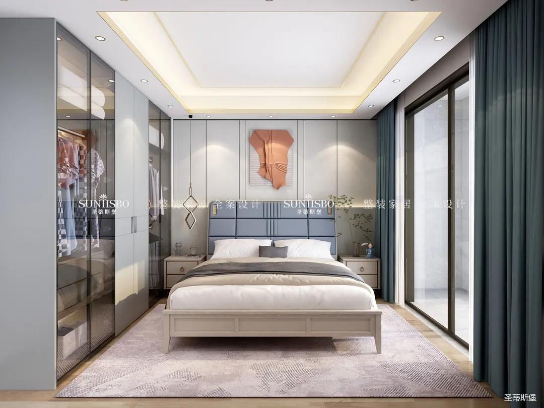 通过空间的叠加与缩放、玻璃透明属性及肌理变化,塑造卧室简奢均衡的气质,也让整个房间静谧又典雅,给业主以无限回味的安定感和幸福感。