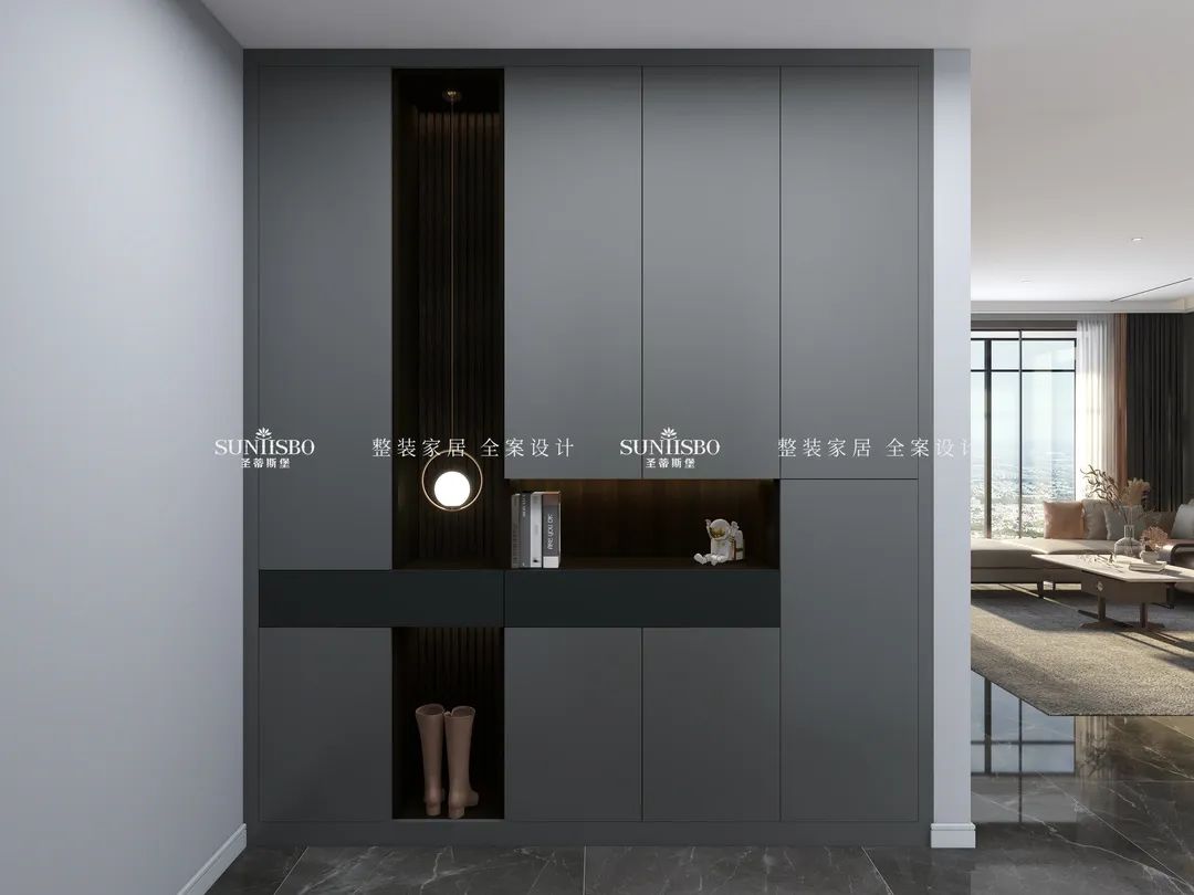 入口玄关处讲究极致简洁,摒弃繁杂的设计元素,地面砖体采用与柜体相近的色调,在界面转折的地方着重连贯统一,让入户空间呈现科技立体感,趣味十足的艺术品摆放,使整体显得高级又有颜值。在其中通过点状灯光设计,带来跃动而富有生命力的视觉焦点,展现出现代时尚感。